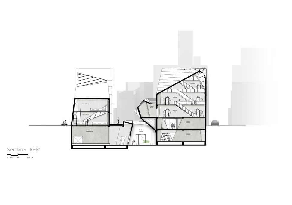 The design brings people in a path of repentance and grief. The ground goes down as the stages progress, with pavilion in between as gathering points. The sunken pavilion acts as an isolator from the outside world, providing a space where one can focus more on self-reflection.
